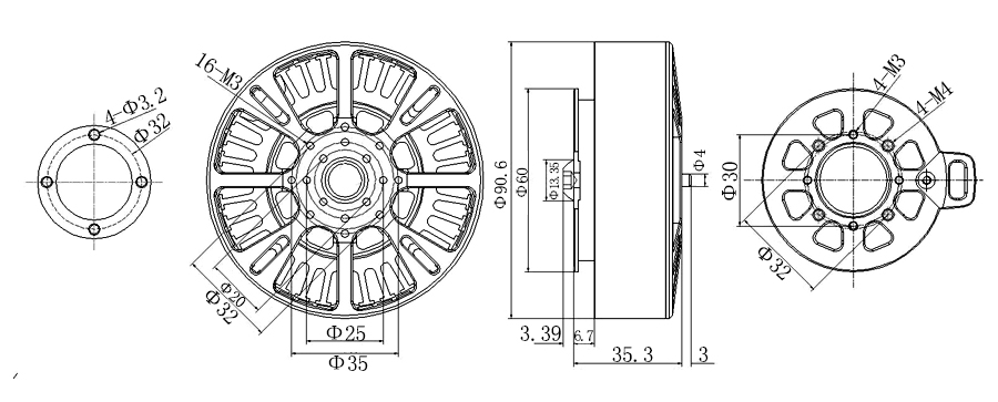 尺寸:Φ90.6*35.3mm 出轴:Φ4*3mm KV:100(可定做) 电调:80A 工作电压:6~12S 重量:631克 配桨:3055-3080 功率:3000W 单电机拉力:14公斤 适用于:20公斤以四轴机型 安装孔:30*30mm 4*M3+40*40mm 4*M4 特点:特殊防水防腐蚀处理;外观专利产品