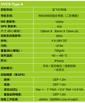 UVCS —Universal VTOL Control System(通用垂直起降飞行器控制系统)是一种先进的垂直起降飞行器(VTOL)用自动驾驶系统,可完成飞行器的自主起飞/着陆、悬停、盘旋、航线飞行及机动飞行等功能。UVCS 设计用于中等及以上级别的无人驾驶飞行器。