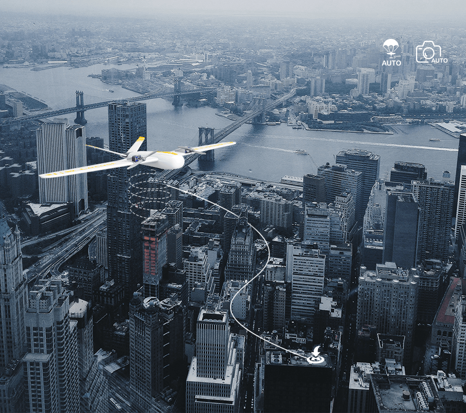 无需手控,自动盘旋升、降,自动控制相机开停拍,自动伞降,精准降落。