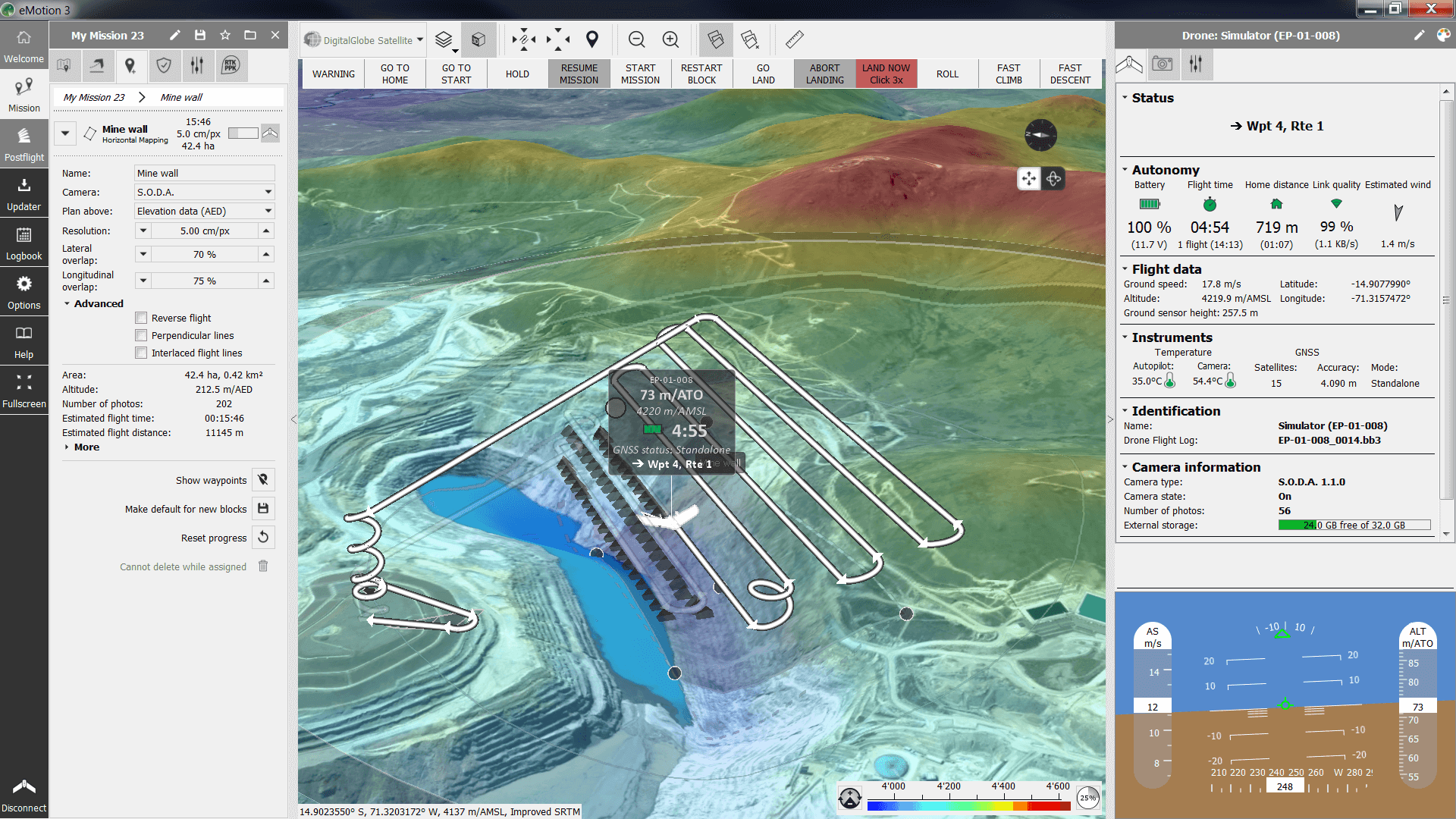 eBee可以掩盖12平方公里(4.6 mi2)在一个单一的自动化映射飞行,而航班较小的地区,在低海拔地区,可以获得图像地面采样到的距离每像素1.5厘米(0.6英寸)。