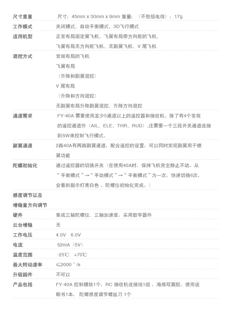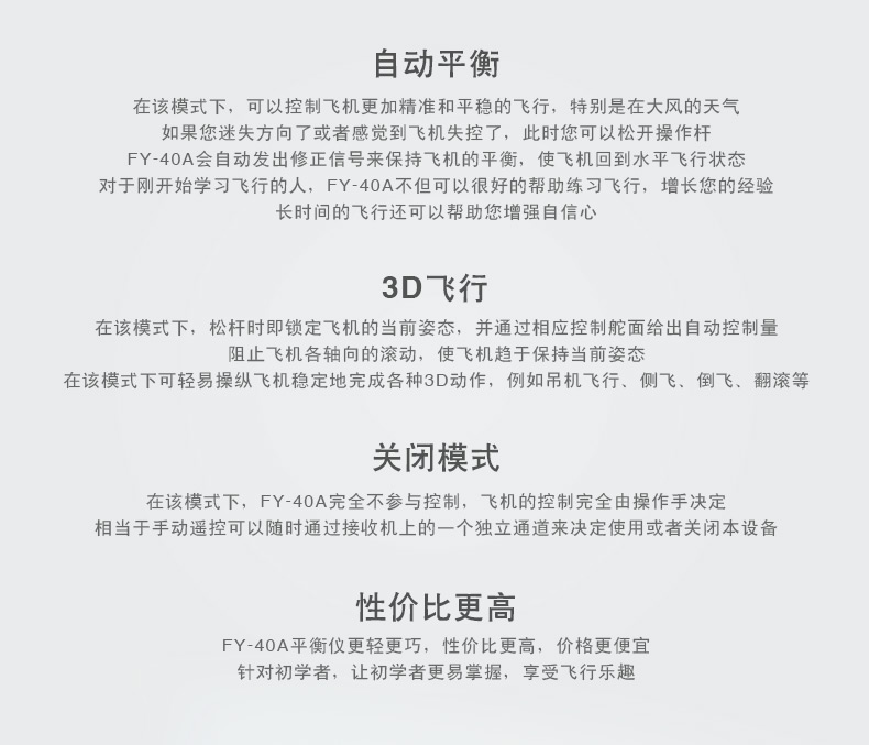 飞宇科技 FY 40A 初学者飞控 电动固定翼 自动平衡 3D