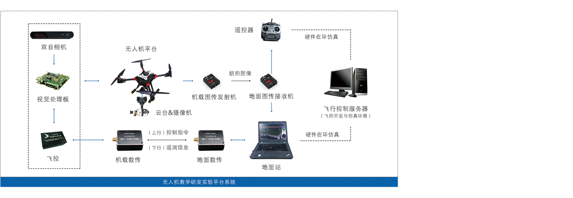 多旋翼飞行器多功能教学研发实验平台系统由多旋翼无人机、多旋翼无人机飞控、云台、摄像头、地面站、开发环境软件、仿真环境 软件等组成。