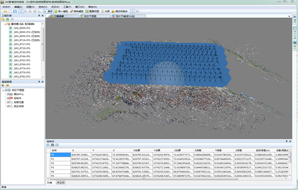 导入倾斜影像、POS数据,DP-Smart经过提取特征点、相对定向、匹配连接点、区域网平差等步骤的运算处理,得到摄区空中三角测量成果。