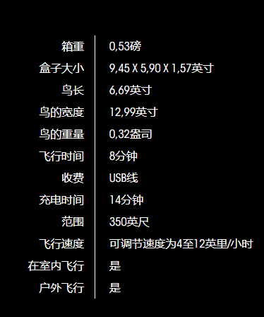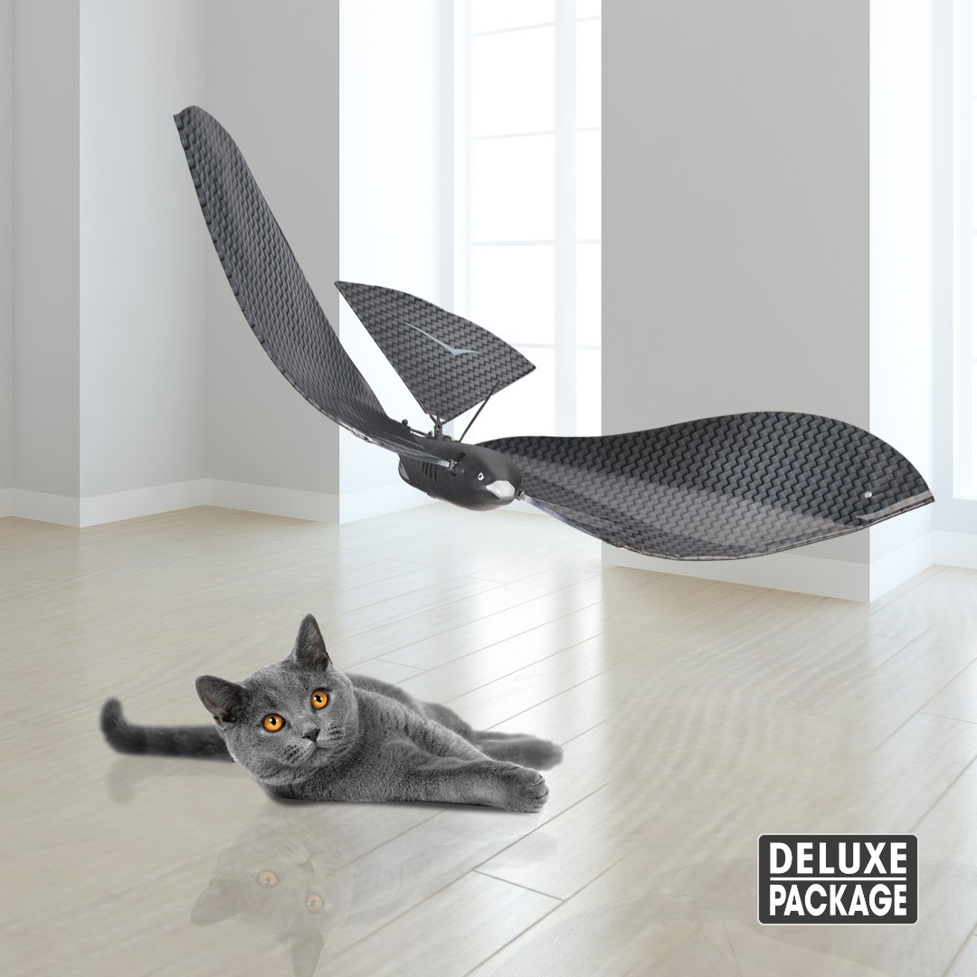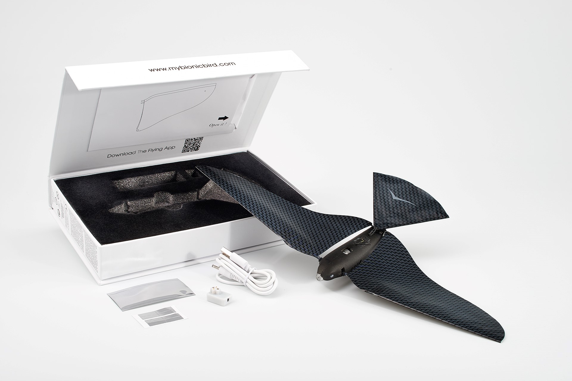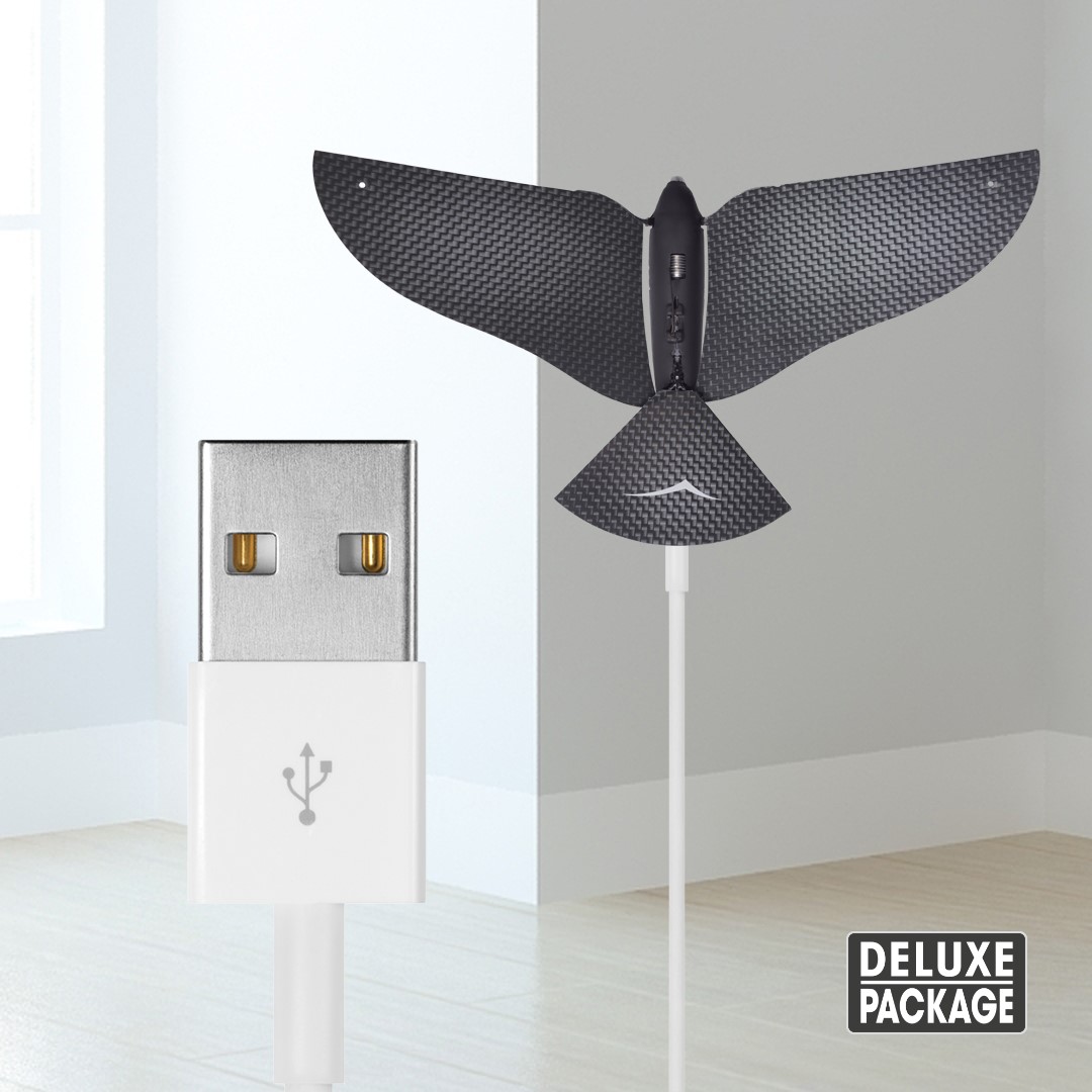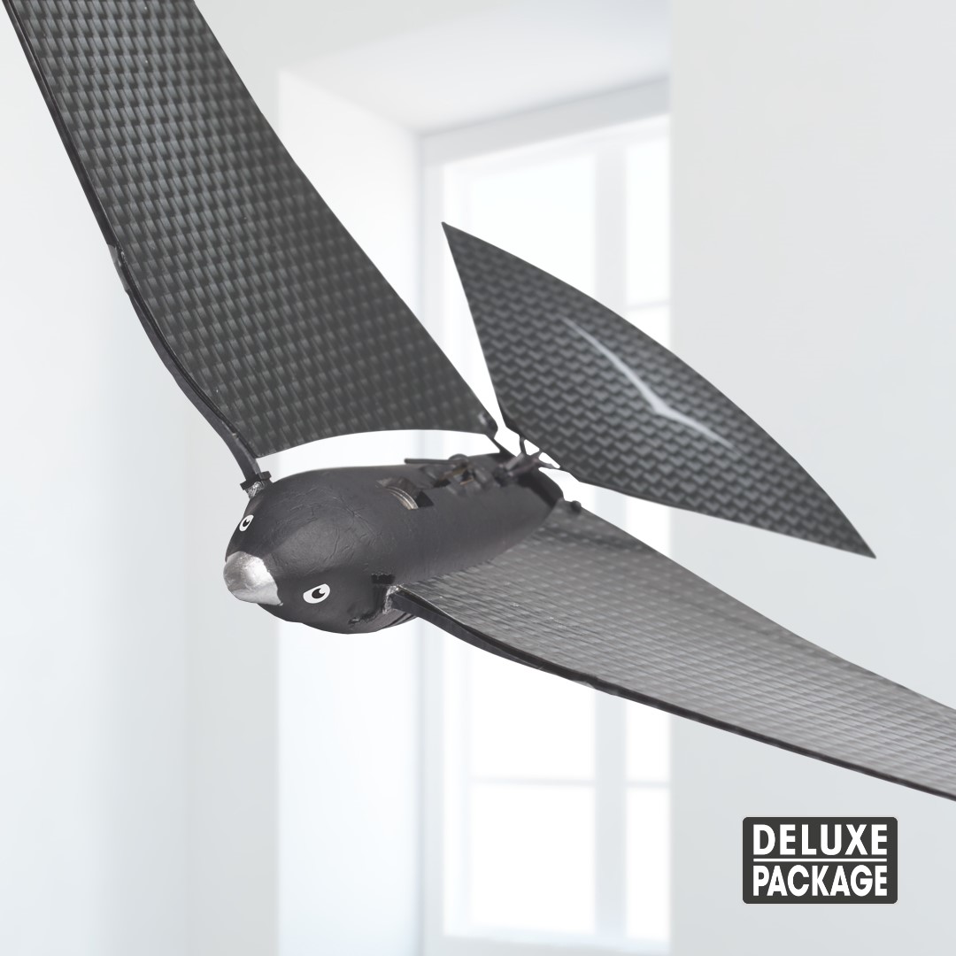 豪华套装采用天鹅绒衬里豪华包装盒,包含:1只完整的鸟类及其一对翅膀(分开 - 只需将翅膀连接起来准备飞行),1个QR码下载免费应用程序,1个USB线及其磁性连接器,通过USB或智能手机适配器为鸟类充电。注意:便携式鸡蛋充电器不包括在内,但可作为附件单独购买。