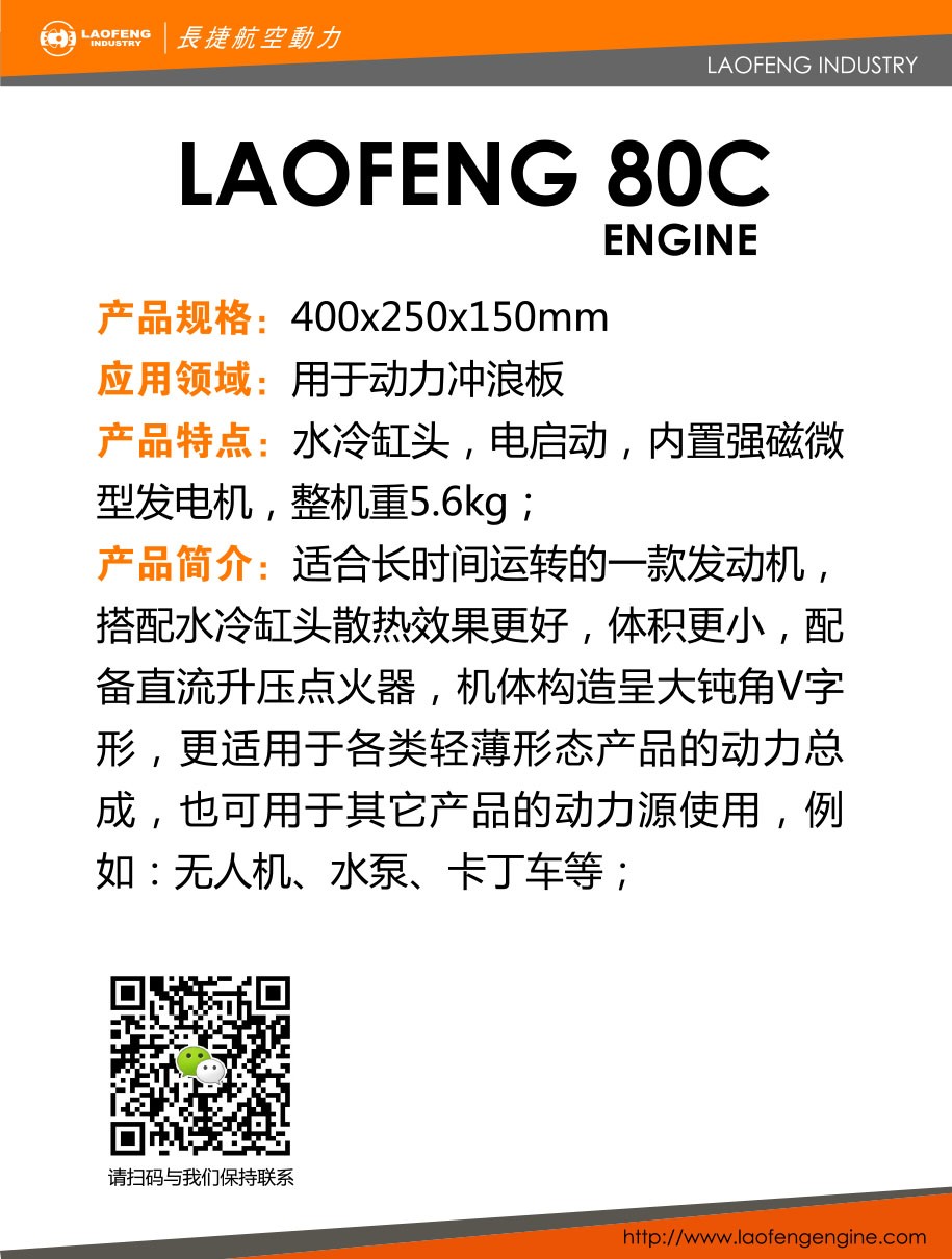 该款发动机是针对无人飞机、便携式消防水泵、卡丁车、动力冲浪板等器材开发的一款多用途的水冷、风冷侧排气口的卧式专用发动机,需要水冷场合时采用铝制双层大面积组合水冷缸头,有速度时可换用风冷气缸。