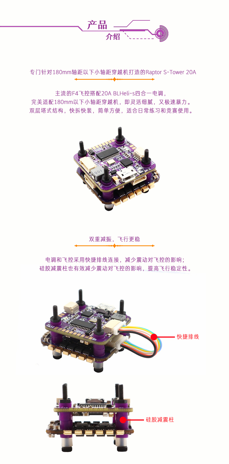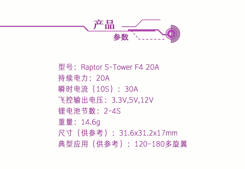 | Raptor S-Tower F4 20A | 20A | 30A | 3.3V/5V/12V | 2-4S | 14.6 | 31.6*31.2*17 |