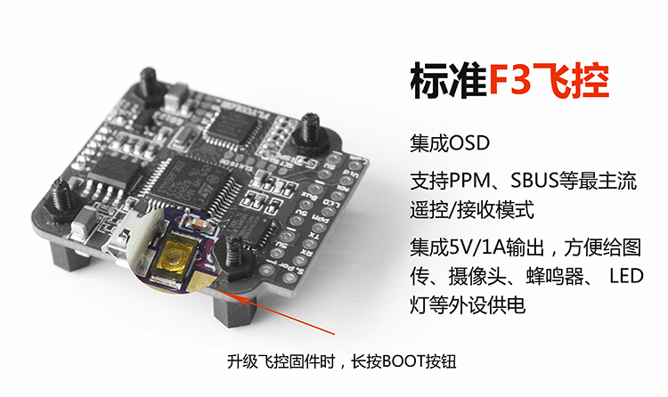 4、 F3飞控,支持PPM、PWM、SBUS等主流遥控/接收模式;飞控集成OSD,不再需要外接OSD设备;集成5V/1A输出,方便给图传、摄像头、蜂鸣器、 LED灯等外设供电。