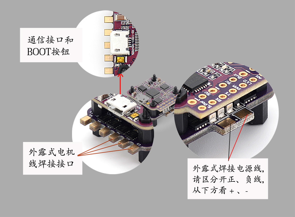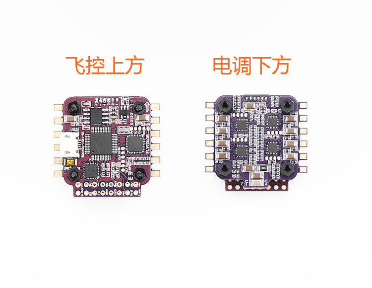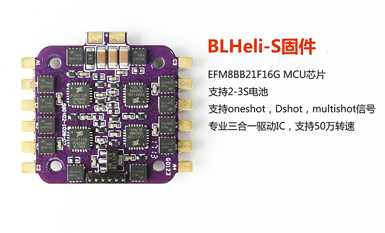1、采用EFM8BB21F16G MCU,工作频率可达50MHz;电调使用BLHeli-S 固件,支持50万转速。