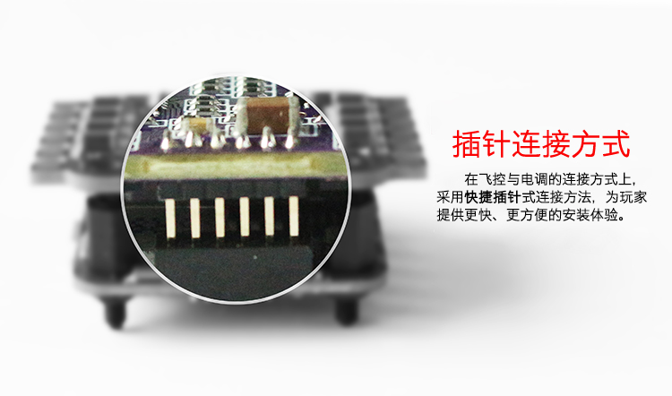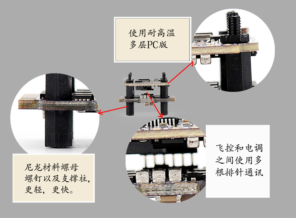 3、 简单的两层塔式结构;电调和飞控之间采用快捷式插针连接,安装方便。