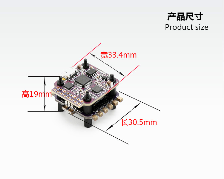 2、 20×20mm安装孔位,体积小,重量轻,适合80-130mm轴距的穿越机。