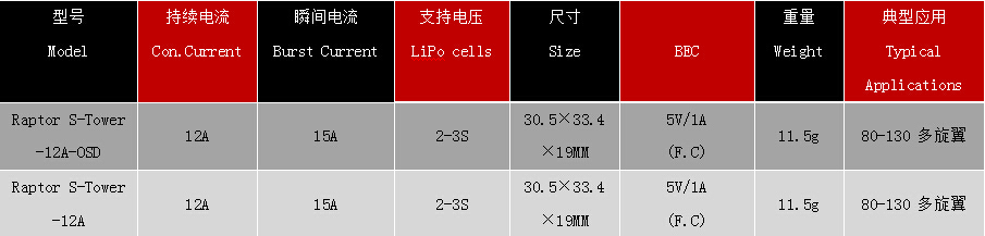 Raptor S-Tower 12A有两个版本,一个是带OSD版本,一个是无OSD版本。带OSD版本和无OSD版本的区别在于:无OSD版本有快插接口和快插线,方便连接图传、摄像头、接收机等;而带OSD的版本则需要对照说明书上的接口定义手工焊接。