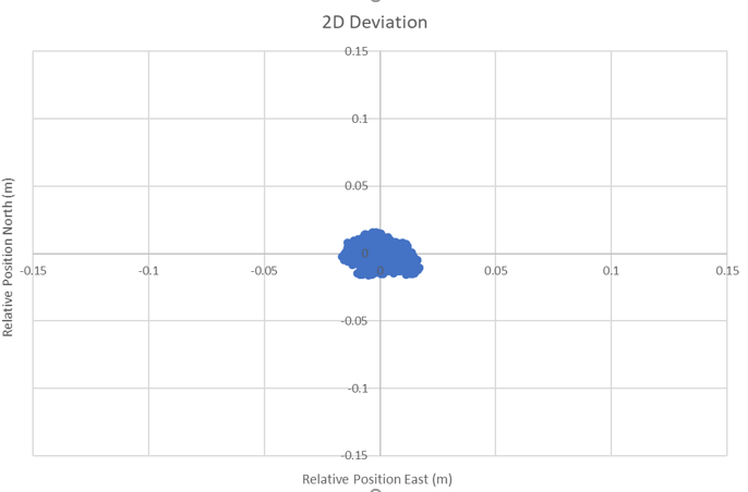 下面示出的位置偏差数据示出的偏差点,指示定位精度非常高的水平的紧密簇. 这个圆形的图案也描绘了一个高度稳定和可靠的修复. 它的更多信息,这与另一个GNSS定位天线之间的比较总结可在可见应用笔记.