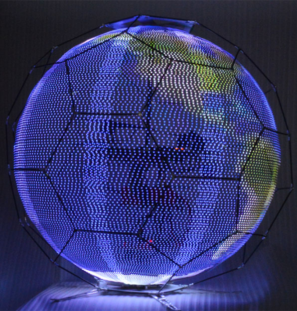 该装置包括一个球形外框,一个内部LED框架,由一系列八个弯曲的LED条带组成,这些LED条带从顶部到底部延伸,一个无人机安装在球体内部,腿部从下面伸出。在飞行过程中,LED框架以快速水平运动的方式在其轴上旋转,形成余像效果,从而产生实心LED静止球体的幻觉。高度机动的无人机几乎可以在任何地方操作,包括音乐厅或竞技场等场所,作为演出的一部分,它可以飞来飞去,或者提供广告信息,活动信息等。