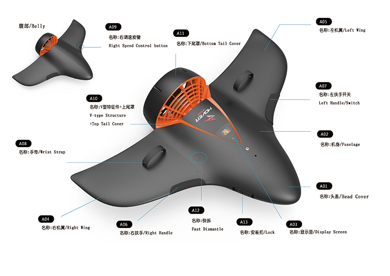水中飞翼由左右机翼、机身、头盖、螺旋桨、尾罩组成,动力系统集成于机身内。机身正面设置水下相机安装孔位,可与水下相机配套使用。