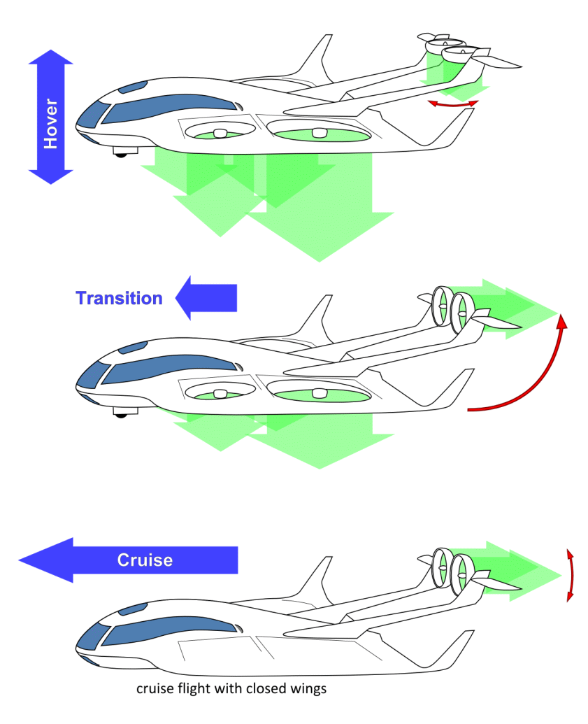 扇形翼设计在巡航飞行中以空气动力学方式包围所有悬停部件,因此可能实现有效巡航飞行的承诺。