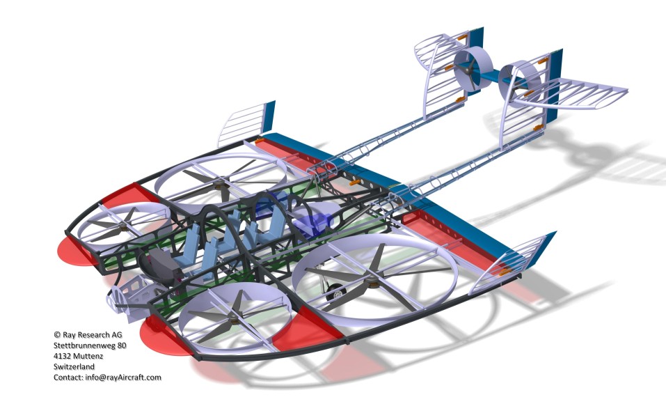 雷设计使用四个大翼扇来制造悬停的升力。它是一种扇形翼设计,专门用作直升机,并在稳定器上增加了倾斜导管。每个机翼包围2个相对较大的风扇,这些风扇彼此相继排列,从而形成特殊的深翼和低翼载荷。当足够高时,后部的两个倾斜导管倾斜到水平并加速Ray飞机。一旦机翼完全支撑飞机,我们就会关闭它们并像传统飞机一样快速飞行。Ray在控制,安全性,经济性和性能方面进一步改进,本网站未详细说明。