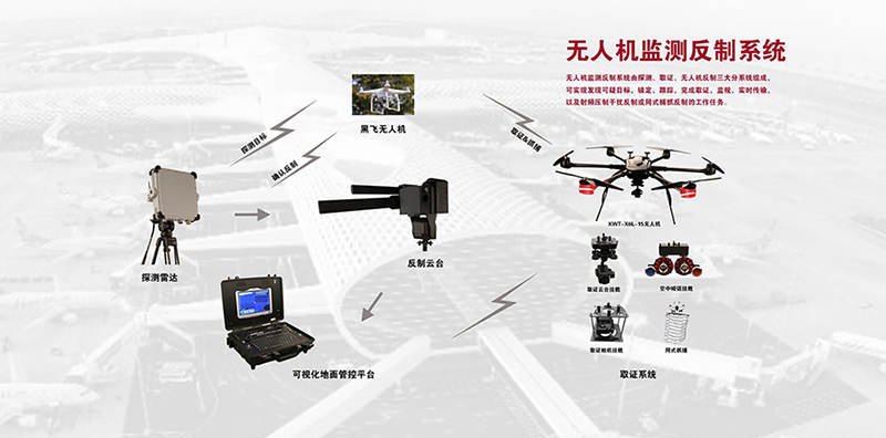 无人机探测反制系统,基于低空雷达探测,实现对无人机的探测、预警和判别,同时联动系统的反制系统、取证系统和抓捕系统。该系统具有完整智能联动性,可对无人机主动探测、发现、取证、反制和抓捕,实现反制有据可依,及时有效,更利于协助监管与破案。