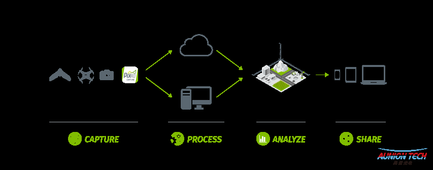 PIX4D mapper数据处理软件作业流程,支持多达10000张影像同时处理—在同一工程中处理来自不同相机的数据—多架次、大于2000张数据全自动处理—直观便捷的界面,便于添加GCP—快速成果图(DOM、DSM等)