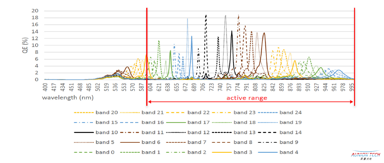 目前IMEC提供三种标准的光谱探测器:100波带的线扫描探测器,25波带以5x5为一个单元的马赛克式镀膜探测器,16波带以4x4为一个单元的马赛克式镀膜探测器,这种方式的光谱带宽一般等于或大于10nm.