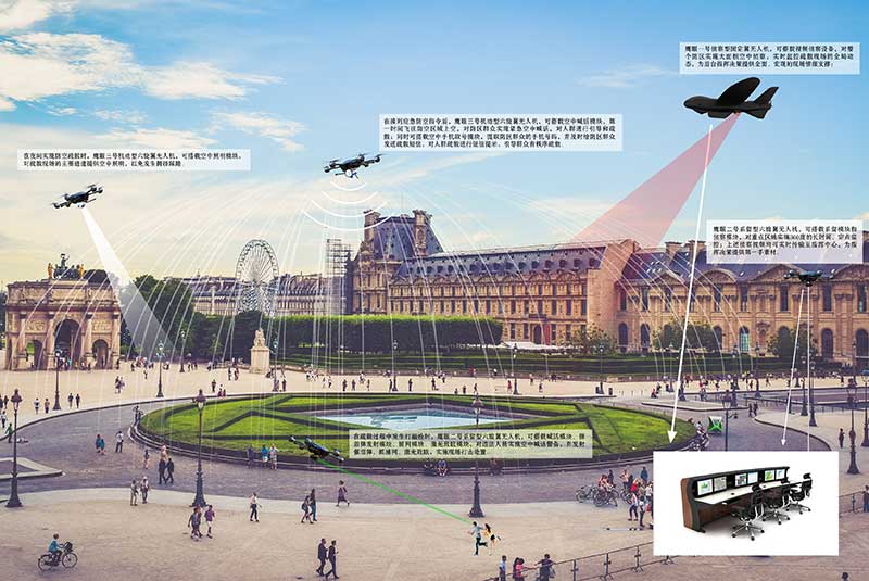 在防区群众疏散过程中,鹰眼一号侦察型固定翼无人机,可搭载视频侦察设备,对整个防区实施大面积空中侦察,实时监控疏散现场的全局动态,为后台指挥决策提供全面、宏观的现场情报支撑;鹰眼二号系留型六旋翼无人机,可搭载系留模块和侦察模块,对重点区域实施360度的长时间、定点监控;上述侦察视频均可实时传输至指挥中心,为指挥决策提供第一手素材。