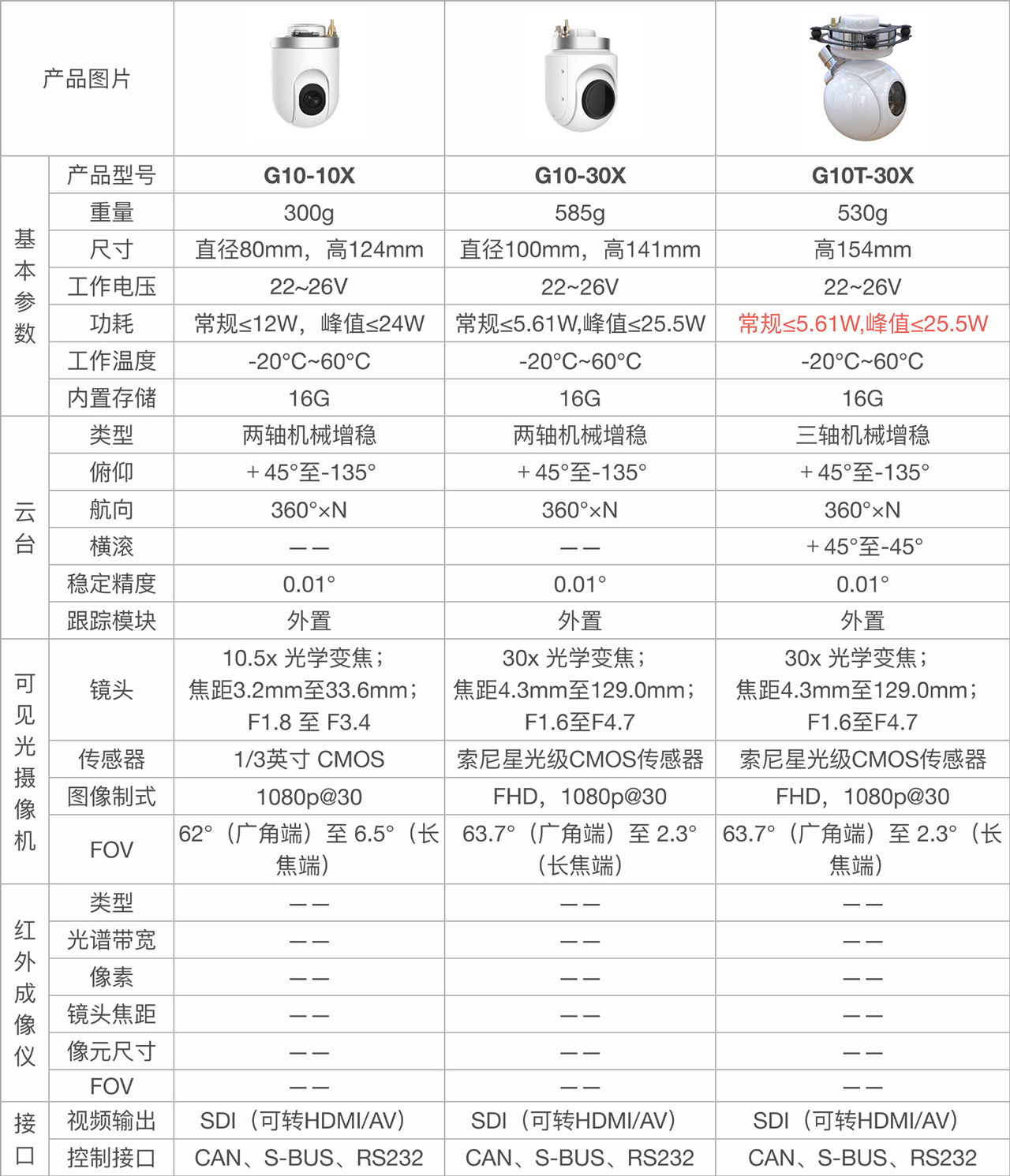 G10-10X、G10-30X、G10T-30X系列吊舱产品集成深度卷积神经网络视觉检测跟踪算法和先进的驱动控制算法,采用了机械增稳技术,增稳精度±0.01°,能实现对移动目标的快速检测和跟踪,具有较高的稳定跟踪能力。