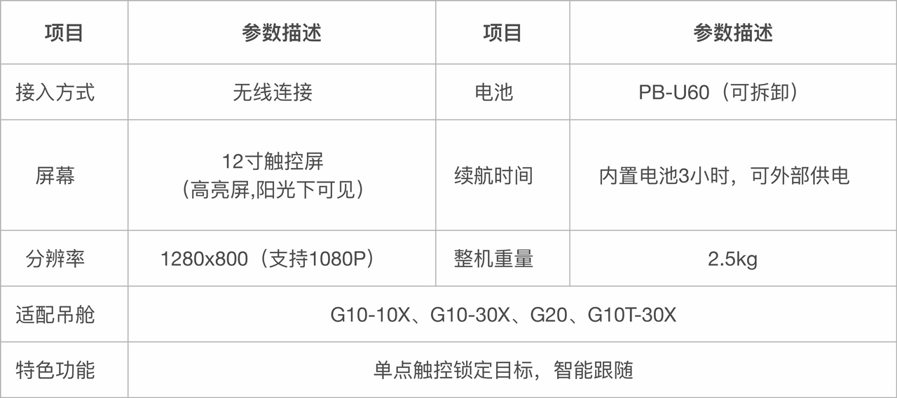 G10-GCS多功能吊舱显示控制器是基于ET30多合一高清图传一体机研发的一款集图像、显示器和吊舱控制器于一体的高度集成触屏控制器,通过简单触控操作即可实现对移动目标的锁定和智能跟随,使用无线通讯方式,免除了线材对操控人员的束缚;具有智能、便携、操作简单等优点。