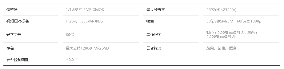 600万像素云台相机具有30倍光学变倍,可在400米外看清车牌,支持航向锁定与航向跟随模式。