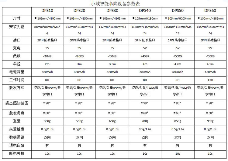 小域智能DPS无人机智能应急伞降系统,内置传感器和电芯以及控制单元可独立运行亦可连接无人机飞控系统配合使用。设备可与无人机飞控双向通讯,实时接收和反馈系统状态。伞降系统每秒检测100次无人机飞行状态,当检测到无人机失控后第一时间弹射开伞帮助无人机安全缓降。可记录100组数据,具备黑匣子功能。