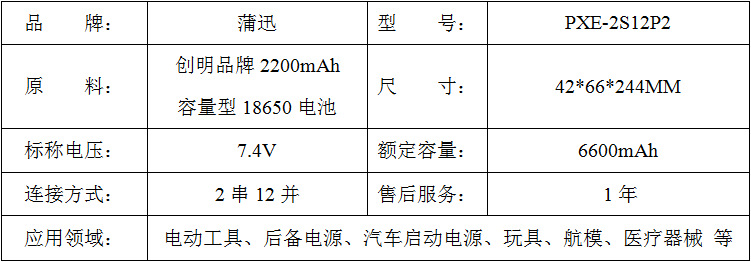 描述价格是基于蒲迅品牌,采用 创明18650/2200mAh电芯的基础上核算得出的,客户可以根据实际需要自行选定电芯品牌,进口电芯:三星、索尼、松下等; 国产电芯:比克、创明、等。我公司会根据你的具体要求认真核算价格,争取以最优的价格,最好的质量,最走心的服务为您打造每一个电池。