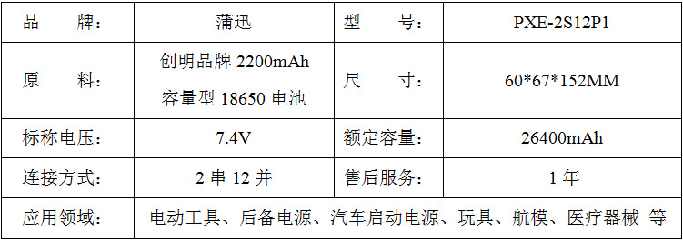 描述价格是基于蒲迅品牌,采用 创明18650/2200mAh电芯的基础上核算得出的,客户可以根据实际需要自行选定电芯品牌,进口电芯:三星、索尼、松下等; 国产电芯:比克、创明、 等。我公司会根据你的具体要求认真核算价格,争取以最优的价格,最好的质量,最走心的服务为您打造每一个电池。