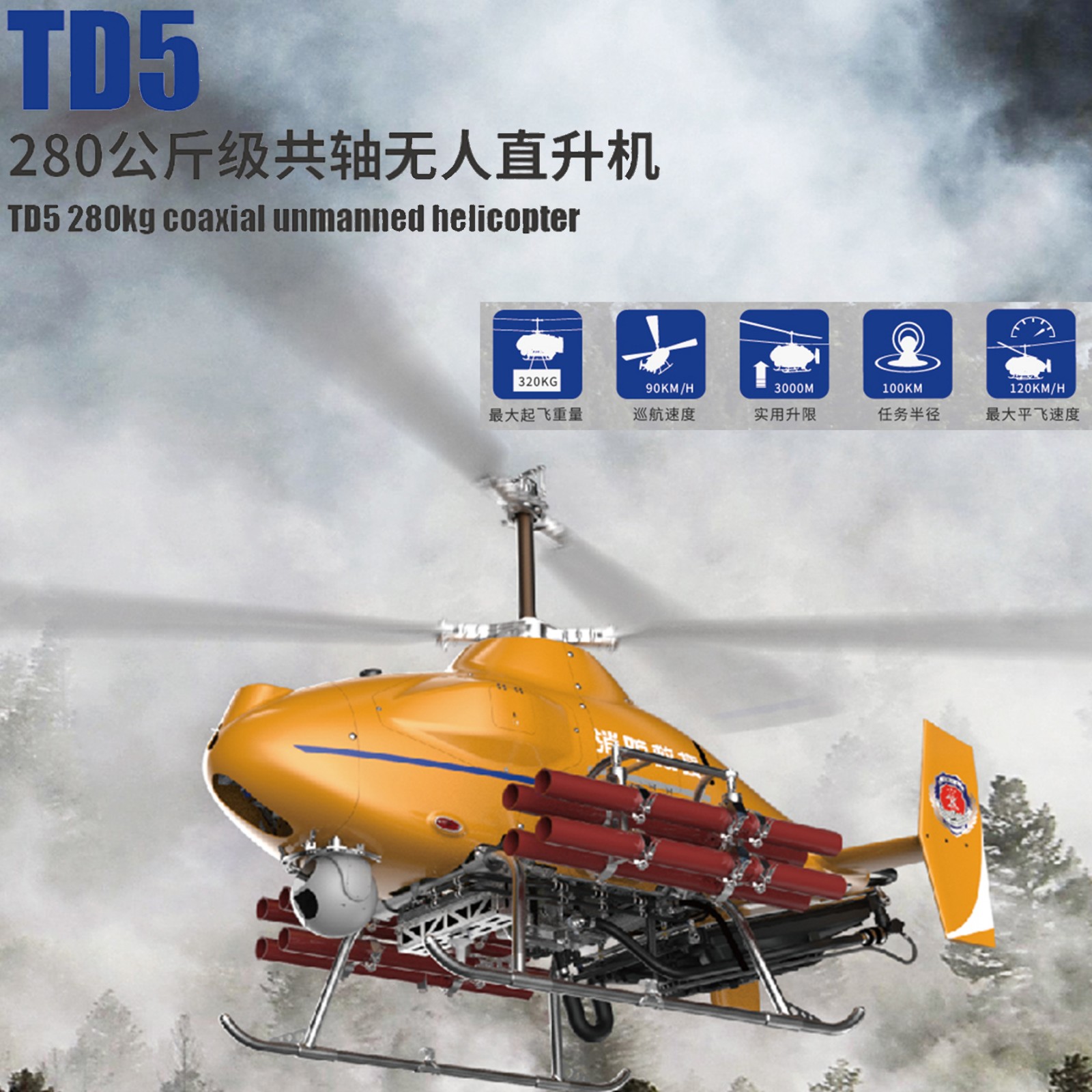 TD5无人直升机是针对城市消防、森林消防和应急救援等方面需求专门研发的消防救援型无人直升机,采用共轴双旋翼构型,具有机身尺寸小、使用机动灵活、可垂直起降和定点悬停、飞行速度快、抗风能力强、对起降场地要求较低且无尾桨失效风险等特点,可在城市楼宇间及山区等狭小环境下起降和使用。