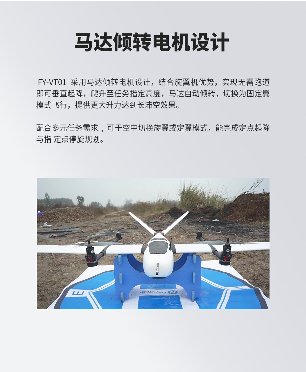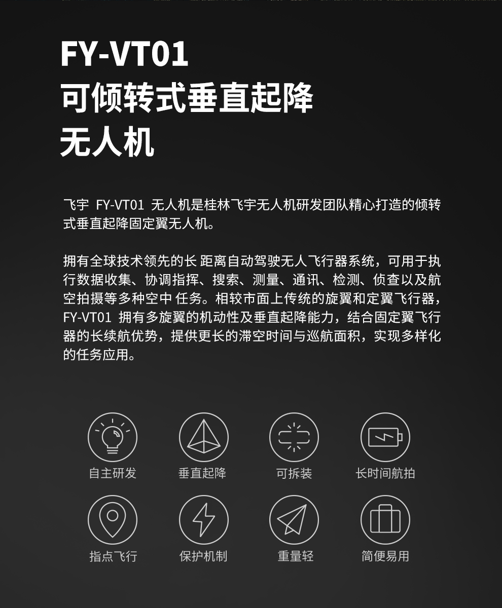 飞宇FY-VT01无人机是桂林飞宇无人机研发团队精心打造的倾转式垂直起降固定翼无人机,拥有全球技术领先的长 距离自动驾驶无人飞行器系统,可用于执行数据收集、协调指挥、搜索、测量、通讯、检测、侦查以及航空拍摄等多种空中 任务。相较市面上传统的旋翼和定翼飞行器,FY-VT01拥有多旋翼的机动性及垂直起降能力,结合固定翼飞行器的长续航 优势,提供更长的滞空时间与巡航面积,实现多样化的任务应用。