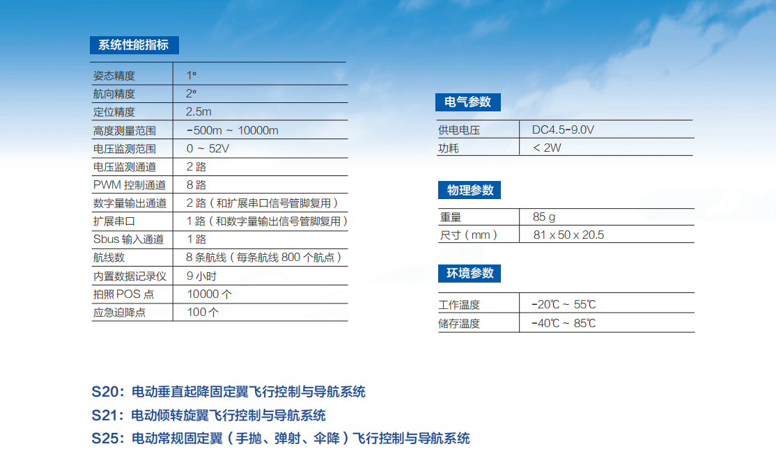 S2 系列飞行控制与导航系统适用于微型及小型电动常规固定翼、垂直起降固定翼、倾转旋翼布局的飞行器,其 内部集成飞行控制计算机、微组合导航系统(GPS/MINS),重量仅为 85g。