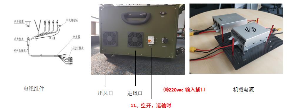 ⑨FC接口:可外接地面站及需要的显示设备;⑩220vac输入插口:配合我公司提供的电源输入线,插入即可通电;