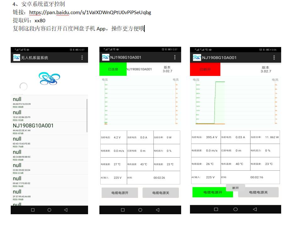 地面电源起始电压可调节范围在380-400V,高压补偿电压可调节范围400-450V,可以根据设定的电压范围值自动的给大载荷负载做电压补偿,增强飞机的载荷能力,目前可以达到100m载荷10kg的参数。