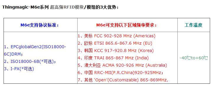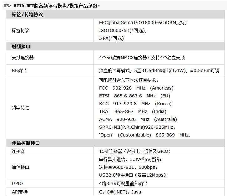 Thingmagic Mercury6e(M6e)嵌入式超高频RFID模块,是专门为企业,商业和工业环境设计,满足在旷阔的范围内的高性能的读写需求。M6e提供优异的超高频防碰撞算法,全球体积最小的四通道RFID模块,全面广泛且完整的软件能帮助并缩短RFID读写器硬件集成公司由开发到推向市场的OEM时间,超高频RFID读写器,提升解决方案供应商提供给最终客户的市场和利益价值。
