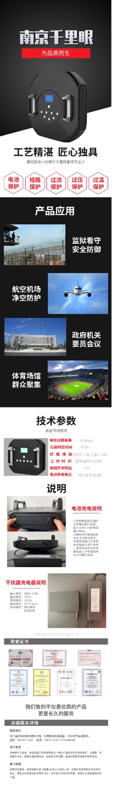QLY-PD1是千里眼航空自主研发的无人机拦 截设备。以多频段多制式定向锁频进行无线电波压 制阻断,应用超高速扫频技术产生多种宽带信号对 无人机进行打击,具有体积小、操作使用方便、可 靠性高、被动式无辐射、 防水效果强、干扰时不影 响用户自身电磁设备等优势;带单片机,可监控核心 模块工作情况。