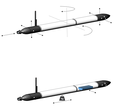 A-AUV的主要特点之一是它的高机动性,在没有任何移动控制表面的情况下可实现。在浪涌方向的运动是由一个双向的后推力产生的。在垂直和水平面上的运动,可以由两对额外的双向推力完成(交叉配置,头部和尾部)。传统的鱼雷形状的AUV只能在固定的速度下运动,由操作者设定速度或表面控制,转向时会受到水流的影响。而F-AUV可以在它的中心旋转,即使尾部推进器掉落也可以进行水平或垂直的转动。浮力和姿态控制的综合运用进一步丰富了载体运动的灵活性,实际上使F-AUV成为一种混合运动航行器,具有标准的自行驱动的AUV功能、远程操作 (ROV)功能和低功耗的海洋滑翔机功能。