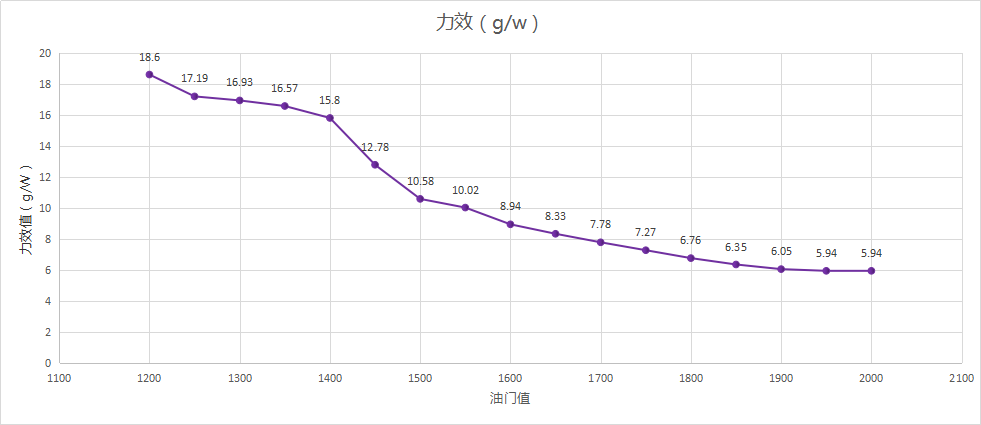| 桨叶型号 | 油门值 | 拉力(g) | 电压(V) | 电流(A) | 转速(r/min) | 功率(W) | 力效(g/w) | 电机最高温度(℃) |
