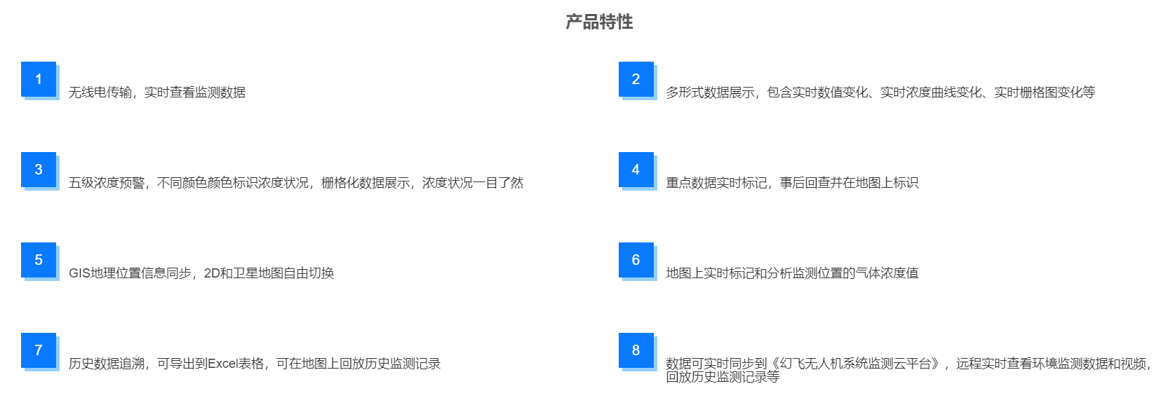 该款无人机通过搭载高清航拍探头,热红外成像仪,高清摄像机、无人机机载智能气体检测仪等设备,在环境应急监测、环境质量监 测、污染源监测、生态遥感等领域大显身手,“企业偷排”、“秸秆焚烧”等不良现象得到有效遏制,成为环保部门环境执法的“利 器”。 无人机悄无声息的巡航到排污企业的上空,空气质量数据、实时画面尽收眼底,让排污企业的违法行为无处可藏。执行复杂条 件下污染物监测,对难以到达的场地进行环保监察,污染物监测数据和污染现场回传画面可作为环保监察线索和依据。针对裸露土方 的覆盖情况,以及城区、郊区的“四烧”问题进行拍照和录像取证,夜间还可对燃煤设施偷排行为开展红外巡航取证。全角度空中侦 别,可以尽快查清污染源,确定污染成因,达到高效、快捷实施辖区污染源监管的目的。