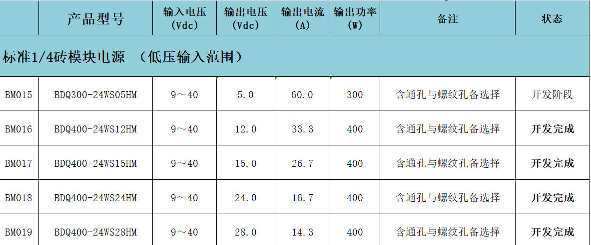 简介:BDQ400-24WS系列是 DC-DC 直流模块电源,9-40Vdc 输入,输出功率 400W;是工业标准四分之一砖封装和引脚,外形结构为全密封式,功率密度高,满足GJB181B。