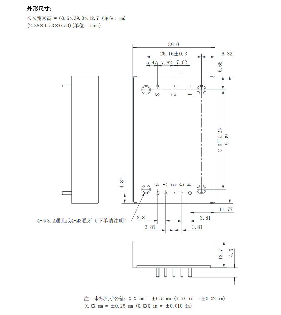 工业标准尺寸: 60.6mm×39.0mm×12.7mm (2.38in×1.53in×0.5in)