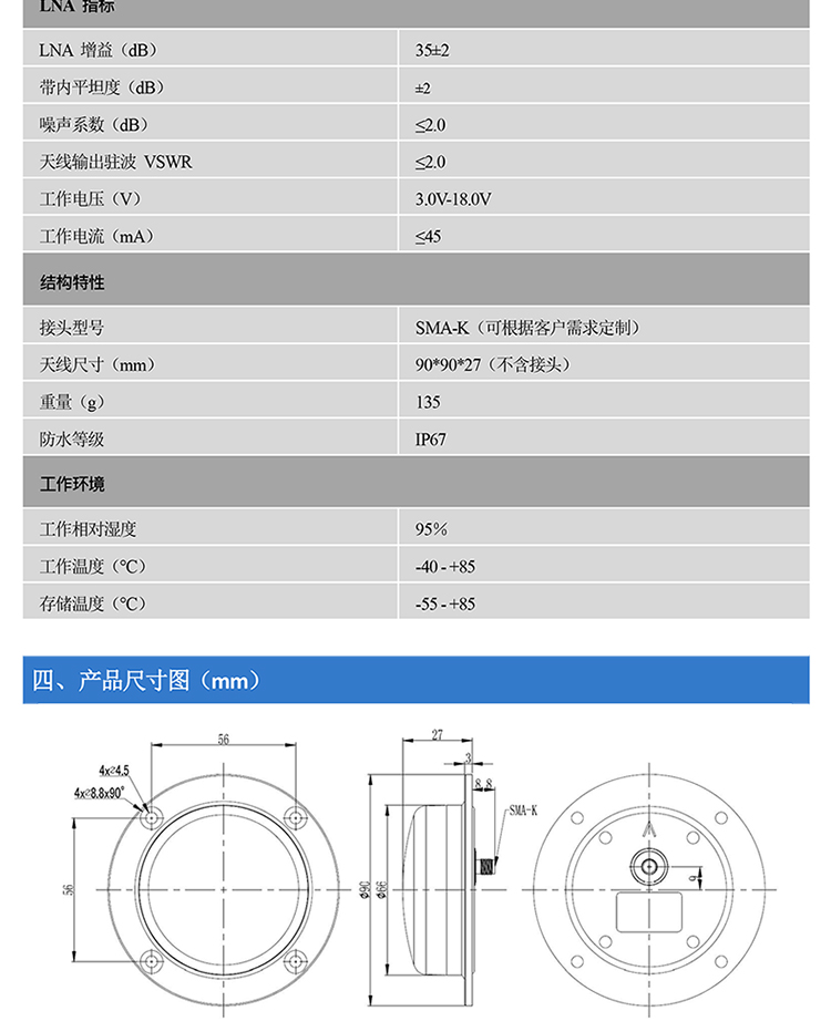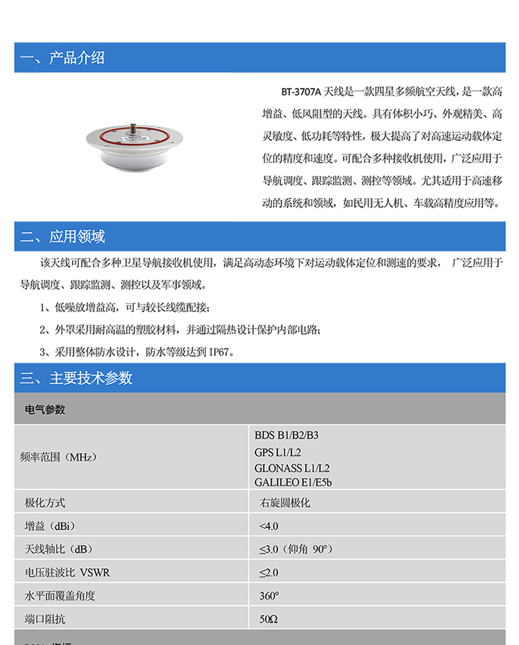 北天Beitian高增益RTK 无人船UAV有轨电车GPS测量四星多频 航空天线 BT-3707A