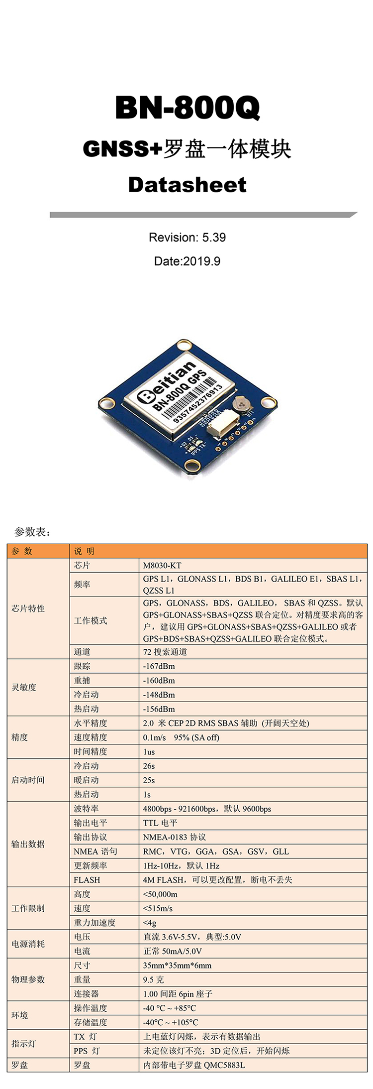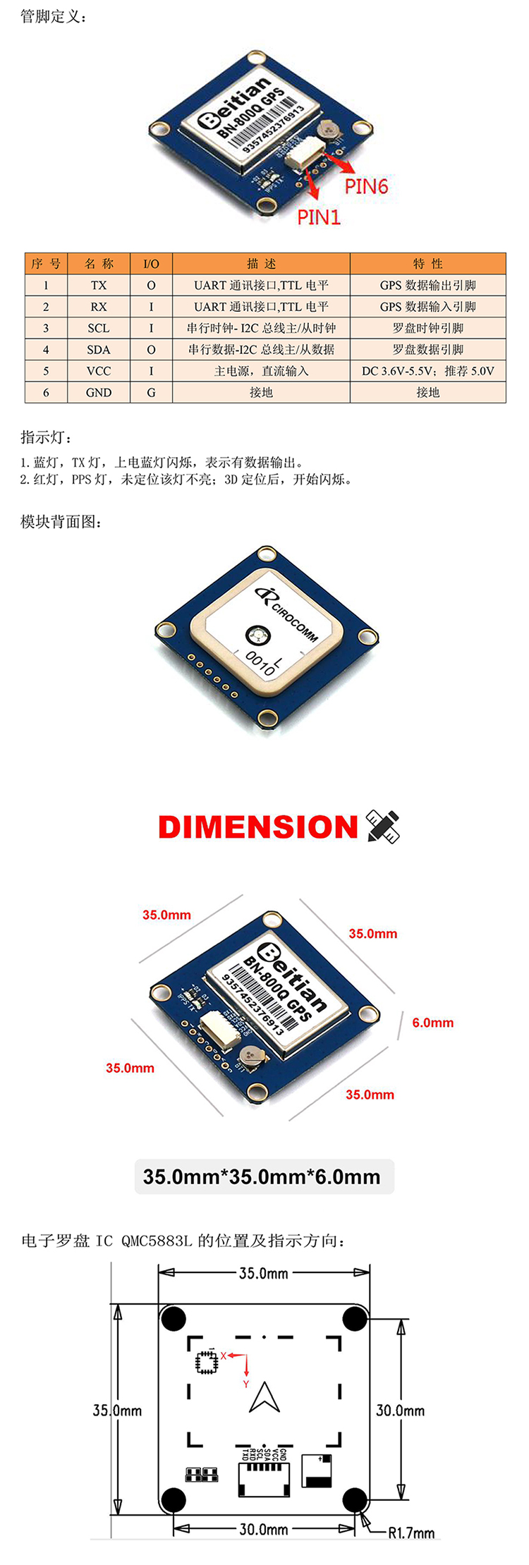 TTL电平输出,9600,1HZ输出,NMEA-0183协议输出,带QMC5883L罗盘。
