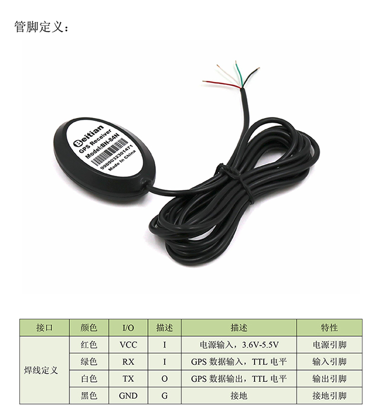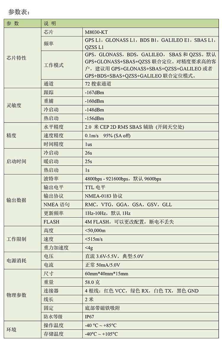 默认出货配置:双模芯片,GPS+GLONASS双模,2米线长,5V供电,TTL电平,9600波特率,1HZ,NMEA-0183协议输出。