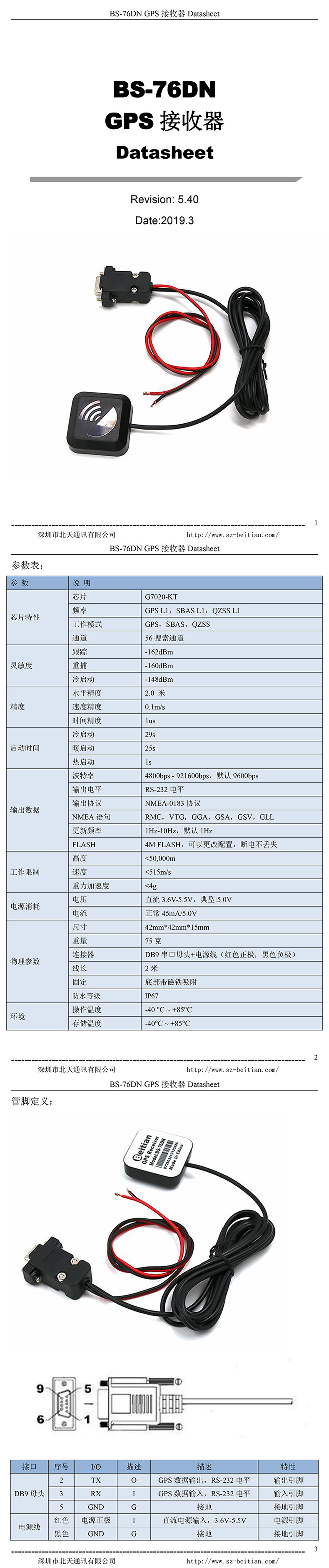 3: BS-76DN 单GPS芯片单GPS模式定位,DB9串口+2根线供电,232电平,2米,5V供电,9600波特率,1HZ,NMEA-0183协议输出。