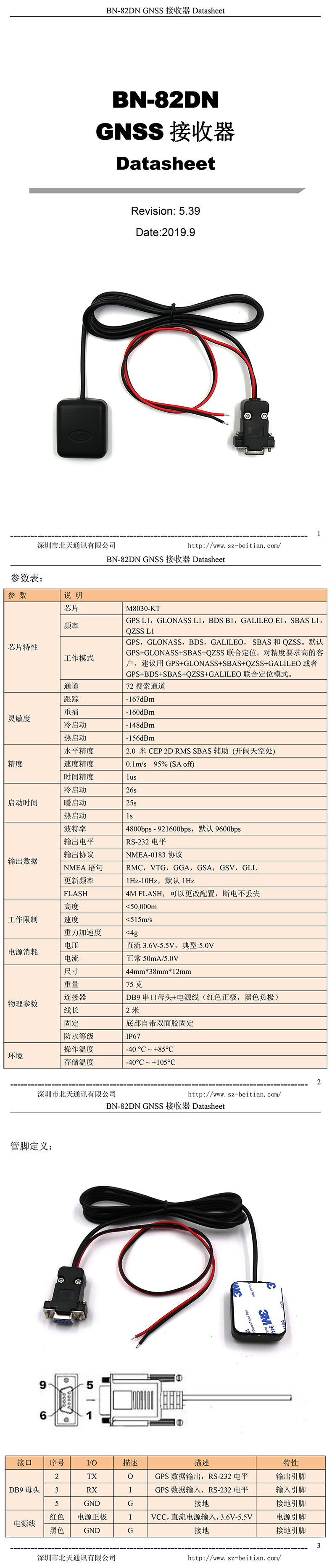 3: BN-82DN 双模芯片,GPS+GLONASS双模,2米线长,5V供电,DB9母头+两根电源线,RS-232电平,9600波特率,1HZ,NMEA-0183协议输出。