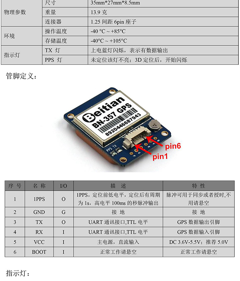 4.BN-357G: GPS+GLONASS双模定位,5V供电,内置FLASH,TTL电平输出,9600,1HZ输出,NMEA-0183协议输出。外置天线