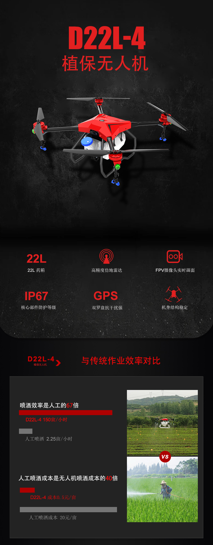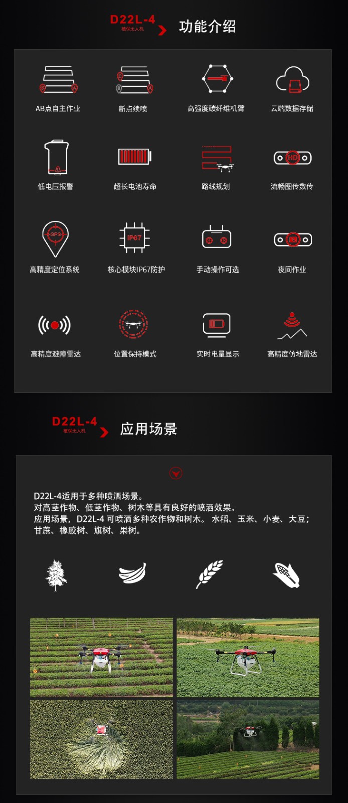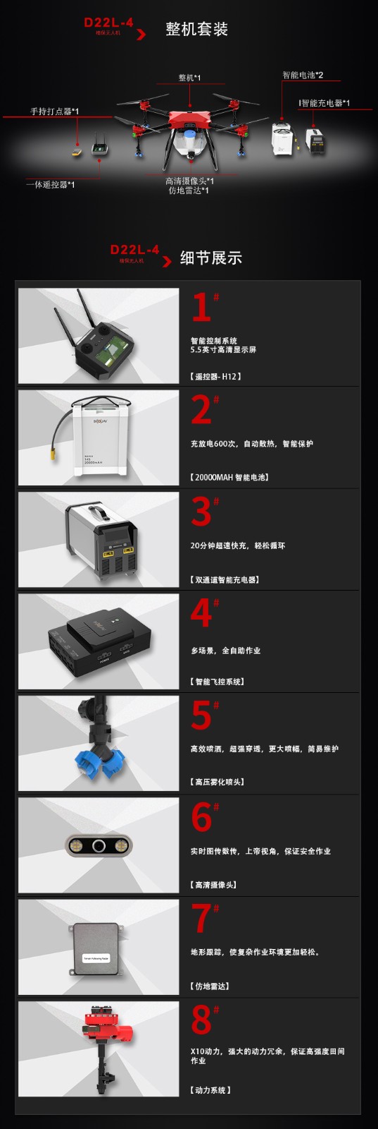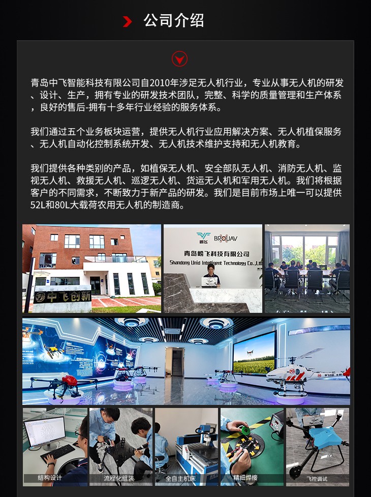 稳定性好 地面站功能 全自主作业 自主规划航线,超级抗摔,夜视功能,加厚碳纤维机臂,高清摄像头,抗风防飘逸喷头,增加雷达空气减震,整机优化,电路药路隐藏,支持智能电池快充充电,定稿雷达避障雷达,采用六轴设计,起落架采用航空铝一体成型,无刷水泵,最大流量8L/min,那个喷头,保证大流量使用雾化效果好,电调全防水,超强寿命,同时水泵增加空气减震