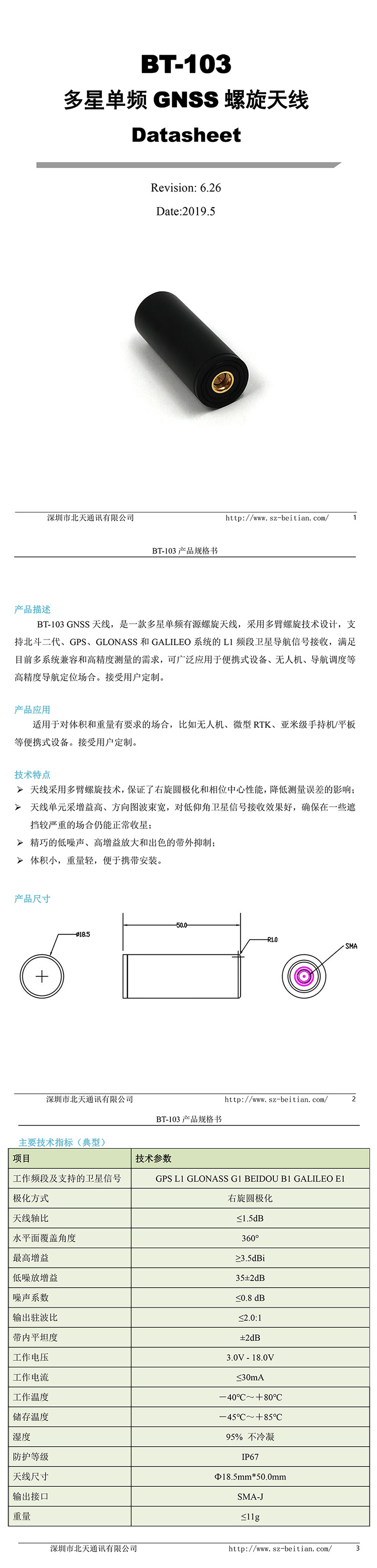 BT-103 GNSS天线,是一款多星单频有源螺旋天线,采用多臂螺旋技术设计,支持北斗二代、GPS、GLONASS和GALILEO系统的L1频段卫星导航信号接收,满足目前多系统兼容和高精度测量的需求,可广泛应用于便携式设备、无人机、导航调度等高精度导航定位场合。接受用户定制。